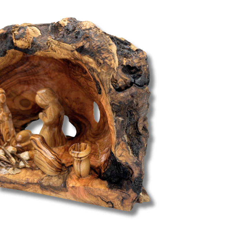 Shaped from natural olive-wood branches, every Nativity features unique grain patterns and organic contours—each one is truly one of a kind. The figurines are securely and expertly glued inside the cave, creating a peaceful, permanent arrangement that reflects the serenity of the first Christmas night.