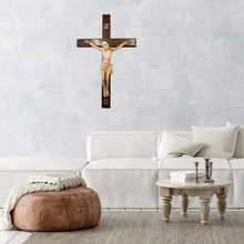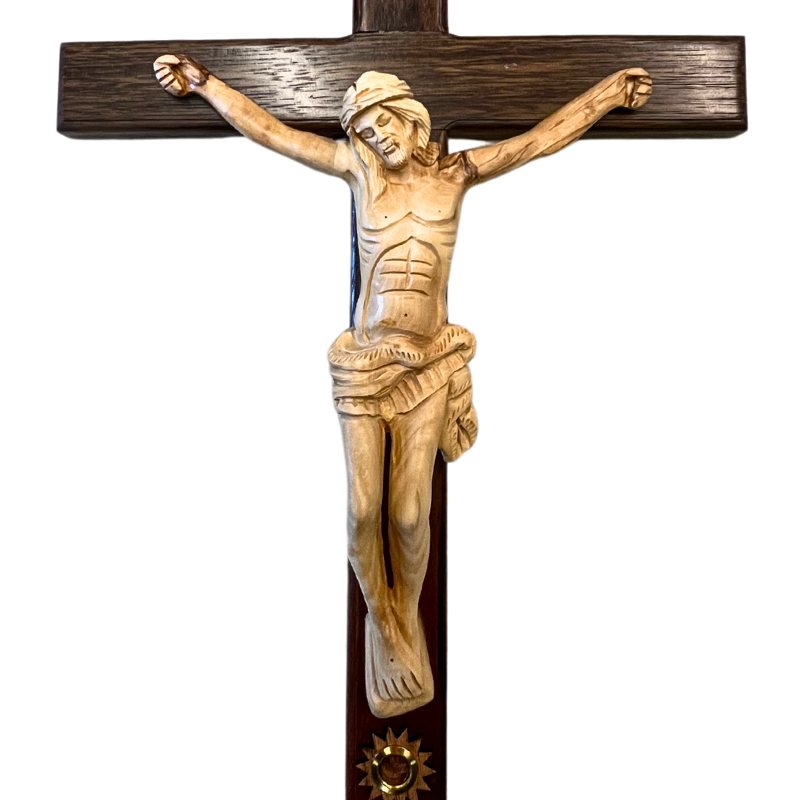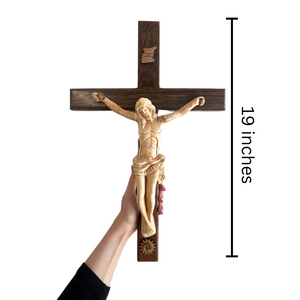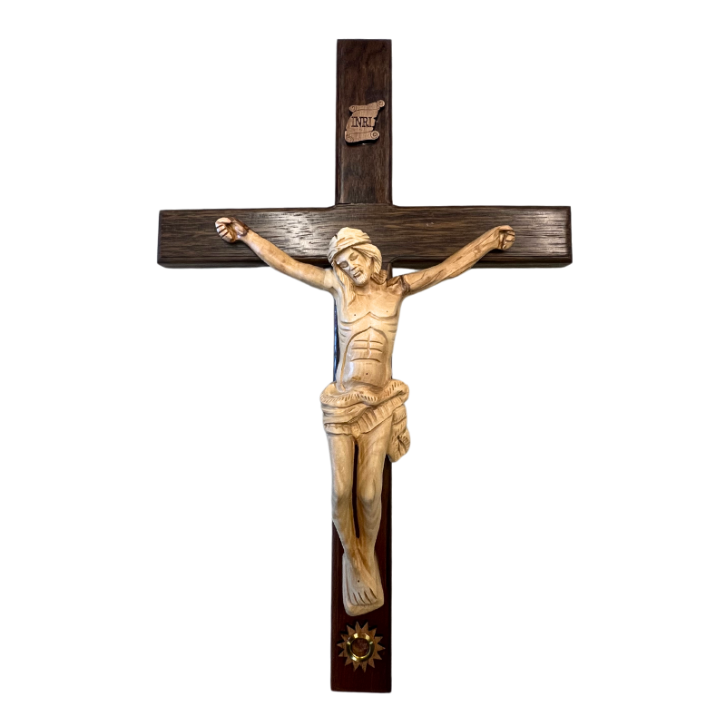 This large handcrafted crucifix is made from high-quality Jerusalem Olive Wood, perfect for placing in large rooms, churches, or any spacious area. Expertly carved by master woodcarvers from Jerusalem and Bethlehem, it symbolizes the moments of suffering, triumph, and victory of Jesus Christ.