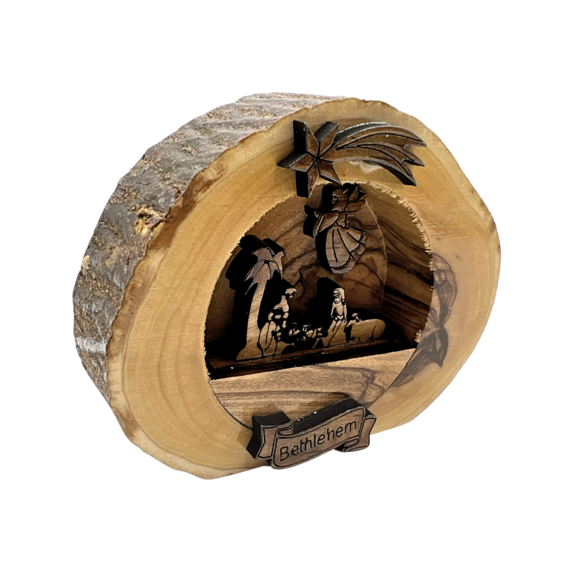 This beautifully carved Nativity Scene is handmade in Bethlehem, using olive wood branches from the annual trimmings in the olive groves of the Holy Land.